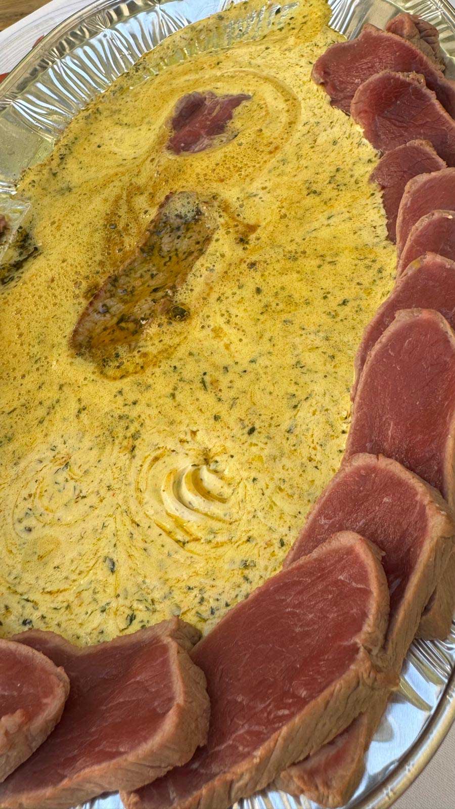 Sobald die Butter durch die Wärme am verlaufen ist, die einzelnen Tranchen in die Mitte ziehen und bis zum gewünschten Garpunkt in der Butter garen lassen. En Guete!