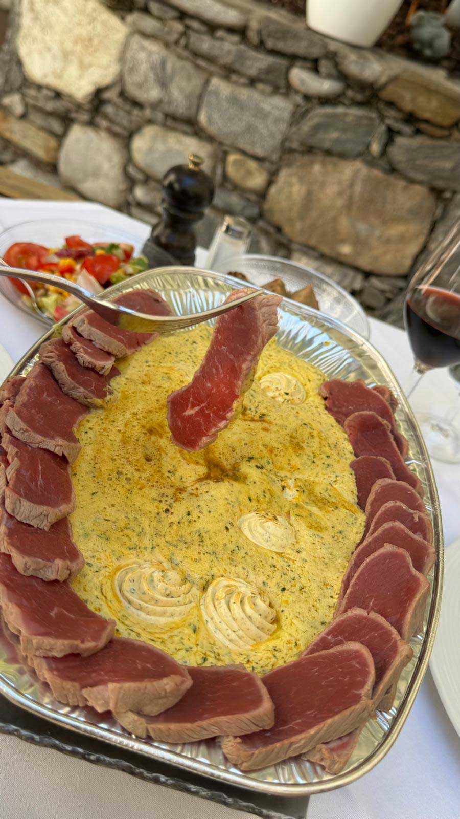 Dazu unsere aromatische Beurre Café de Paris aus feinster Schweizer-Alpenbutter und einer geheimen Kräutermischung, welche für ein unvergessliches Erlebnis in Ihrem Gaumen sorgt.